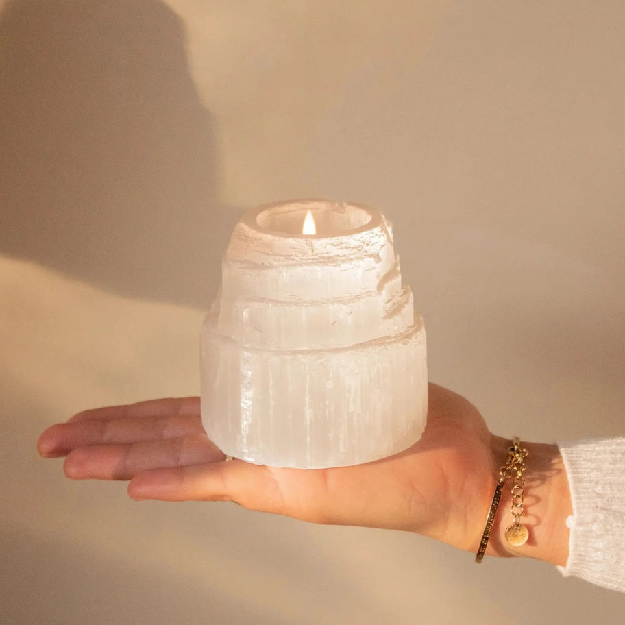 The Selenite Tealight Tower features a delicate design inspired by the iconic Selenite tower shape, crafted to hold a tealight candle. Its radiant white crystal brings a gentle, calming light that harmonizes beautifully with natural materials and cozy surroundings.